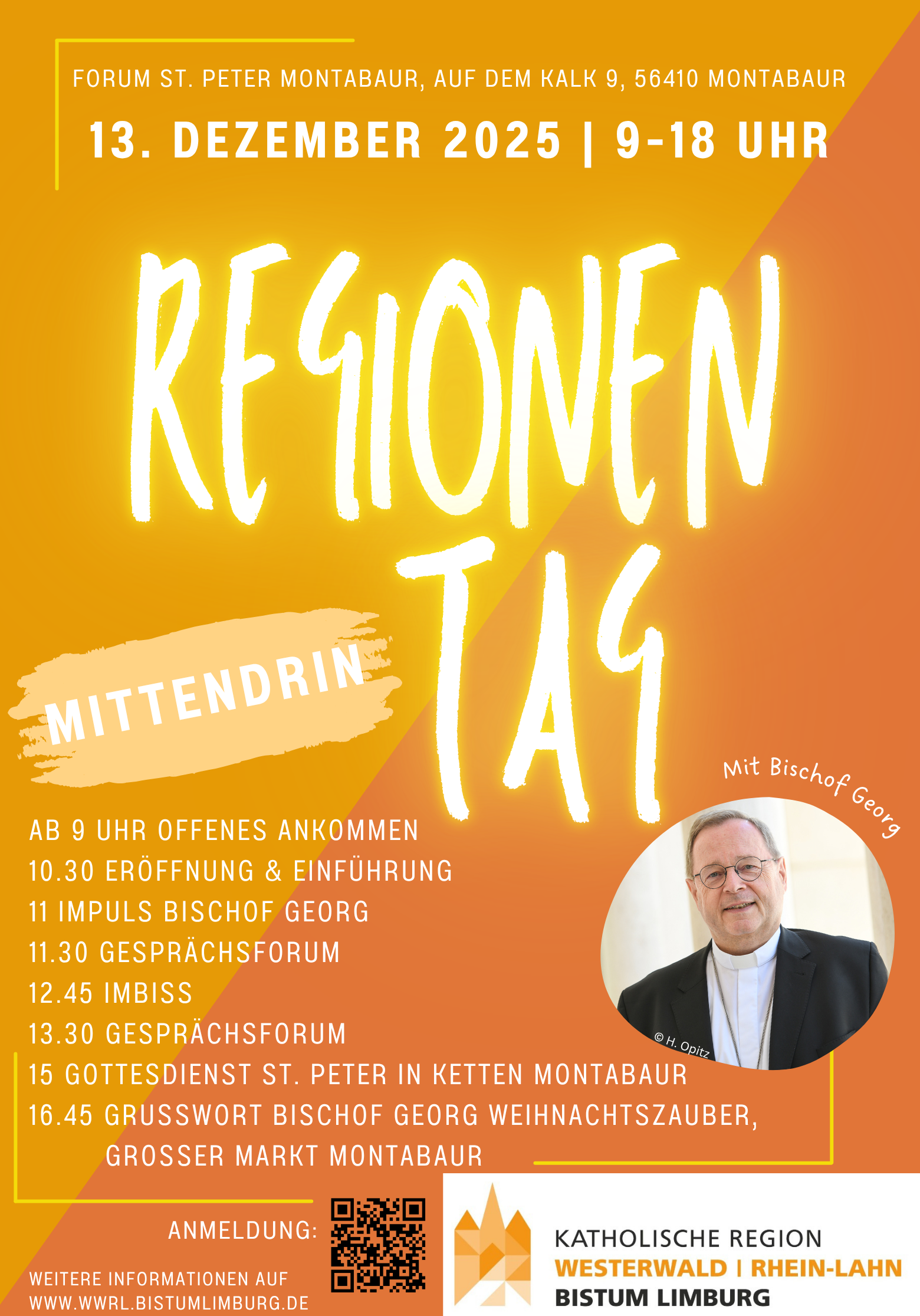 Am 13. Dezember ist es soweit: Bischof Dr. Georg Bätzing besucht die Katholische Region Westerwald | Rhein-Lahn. Gemeinsam mit der Regionalleitung und dem Regionalsynodalrat freut er sich bereits jetzt schon auf viele Begegnungen im Rahmen des vielfältigen Programms dieses Tages, beim Gottesdienst in der Pfarrkirche St. Peter in Ketten in Montabaur und auf dem Weihnachtsmarkt in Montabaur.