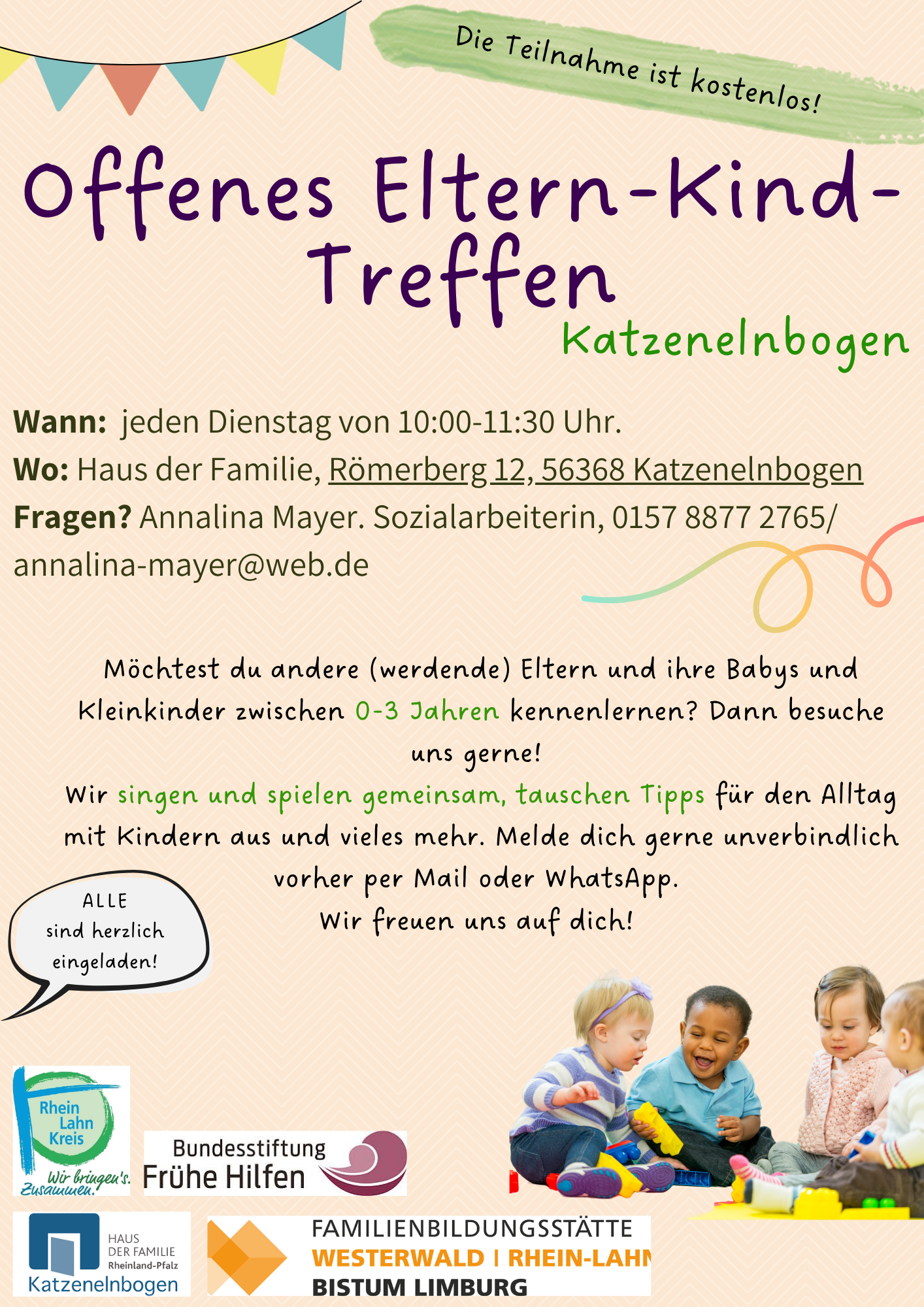 Wir singen und spielen gemeinsam, tauschen Tipps für den Alltag mit Kindern aus und vieles mehr. Melde dich gerne unverbindlich vorher per Mail oder WhatsApp.
